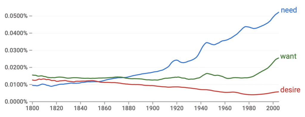 If you include “needs,” it jumps to once every 1,600 words … a six-fold rise since 1800.